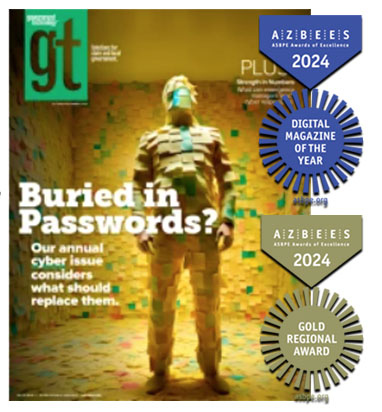 At the regional level, GovTech received a design category Gold Award for the two-page opening spread of its October/November 2023 cover story: “Death of the Password?” This award covers ASBPE’s Pacific region, comprising Alaska, California, Hawaii, Nevada, Oregon and Washington.